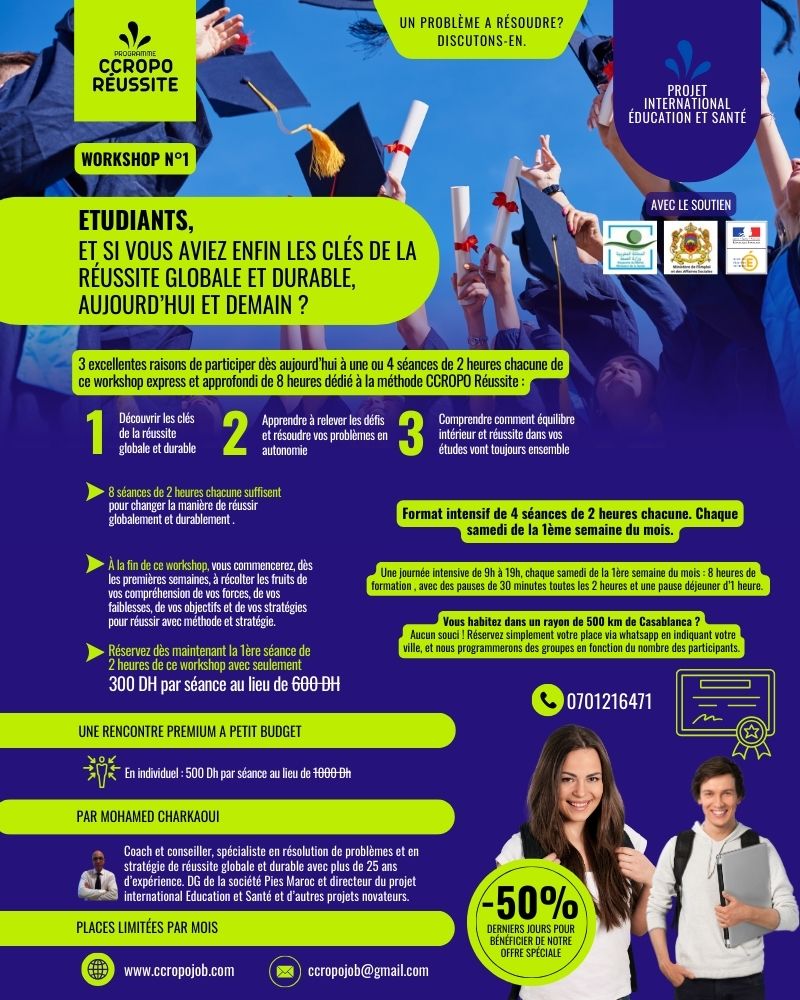 وبصفتكم آباءً وأمهات، أو آباءً مستقبليين، أو تلاميذ، أو طلبة، أو باحثين عن عمل، تقترح عليكم PIES Maroc أيضًا ورشات عمل سريعة ومعمّقة، تهدف إلى تعزيز الازدهار الشخصي، والنجاح الشامل، والحفاظ المستدام على الصحة الجسدية والنفسية.
