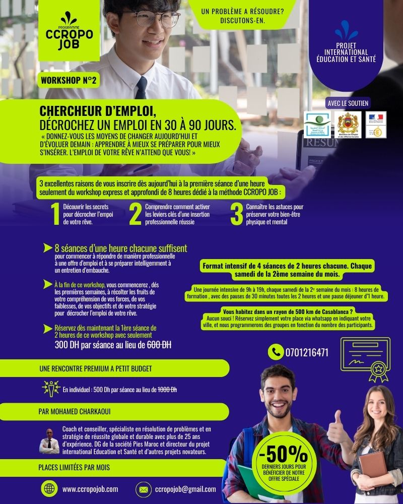احجزوا الآن الورشة التي تناسب حاجتكم الحالية بإرسال رسالة عبر البريد الإلكتروني إلى: ccropojob@gmail.com أو عبر واتساب على: 0787189008 تتضمن المعلومات التالية: الاسم الكامل (الهاتف، المدينة، الحي)، أرغب في حجز الورشة رقم (...) (فردي أو جماعي — حضوري أو عن بُعد)، ورقم الرمز الترويجي (إن وُجد).